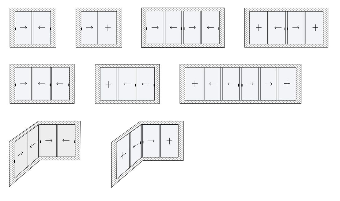 Угловая система может быть реализована как с глухими частями по краям конструкции, так и с подвижными створками. Вход в помещение можно осуществлять как через центральные угловые створки, так и через боковые, когда открывать центральные створки нет необходимости.